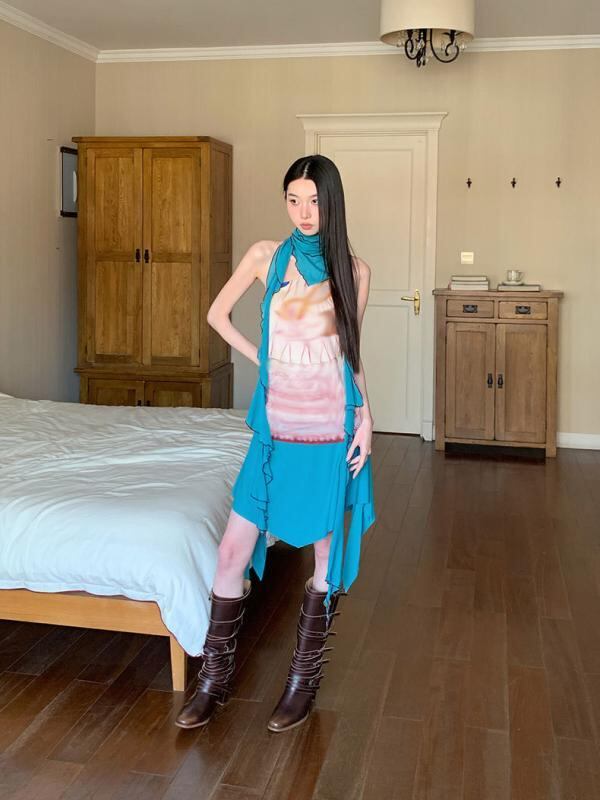 ワンピース レディース 復古 印花柄 ノースリーブ 膝丈 吊りスカート セクシー メッシュ 切り替え スリムフィット おしゃれ かわいい 普段使い パーティー