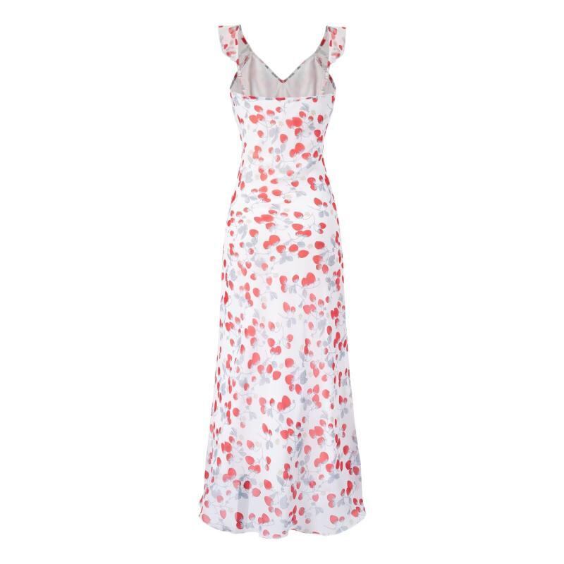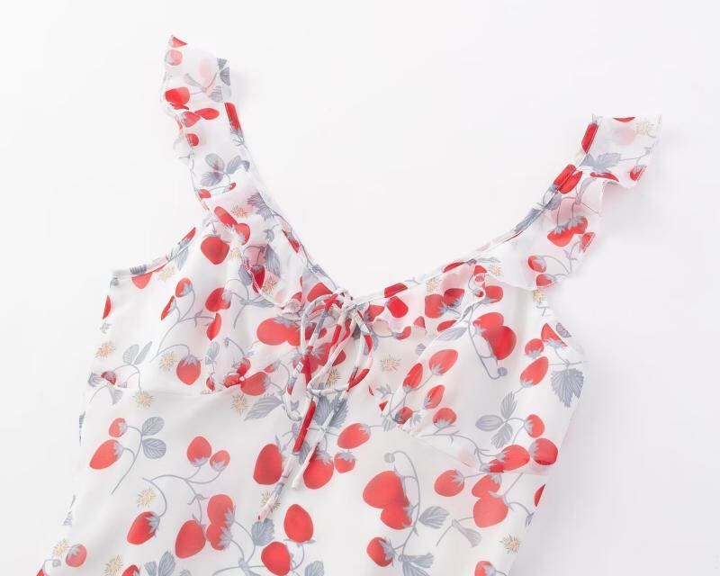 ワンピース レディース Vネック ストロベリー柄 高見え ポリエステル 吊りスカート ロングワンピース かわいい きれいめ フェミニン デート お呼ばれ パーティー 旅行