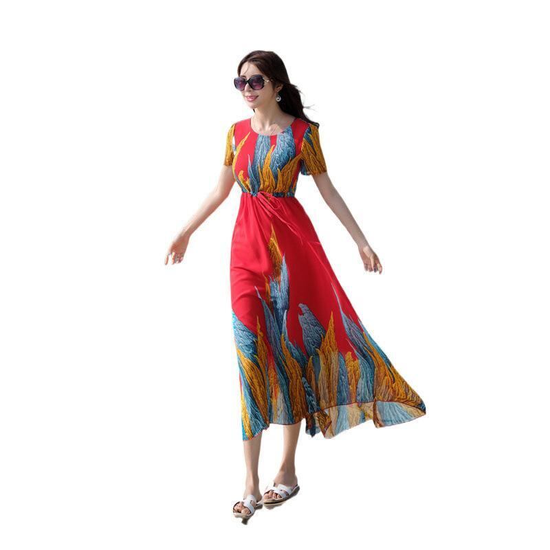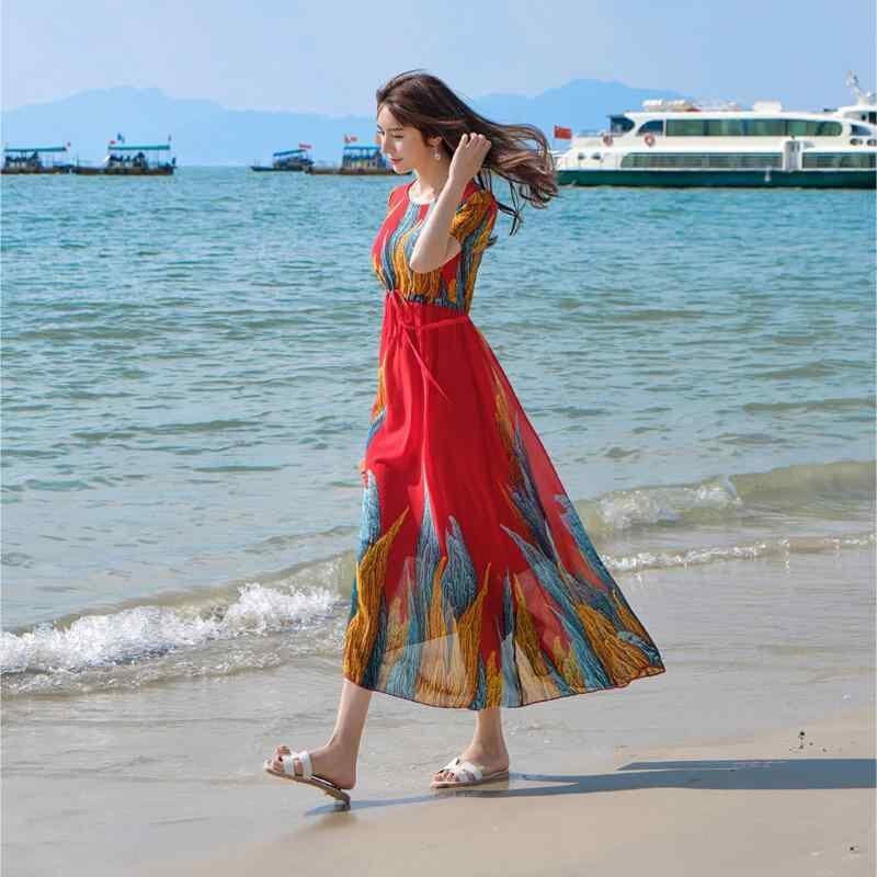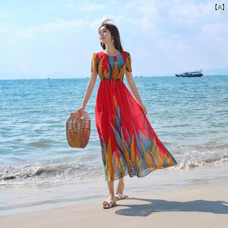 ワンピース レディース タイ リゾート ビーチ バカンス エレガント ボヘミアン ロング丈 ドレス フレア シフォン 半袖 パフスリーブ ラウンドネック 春夏