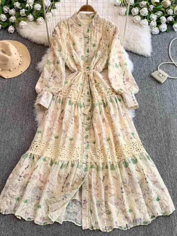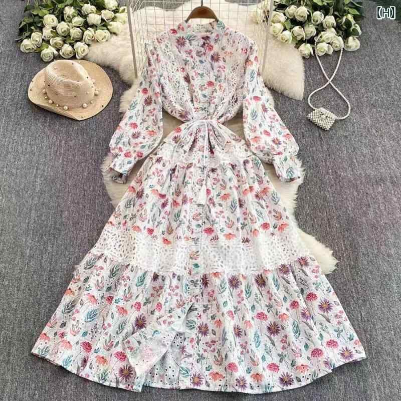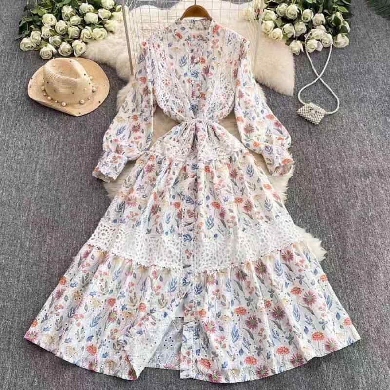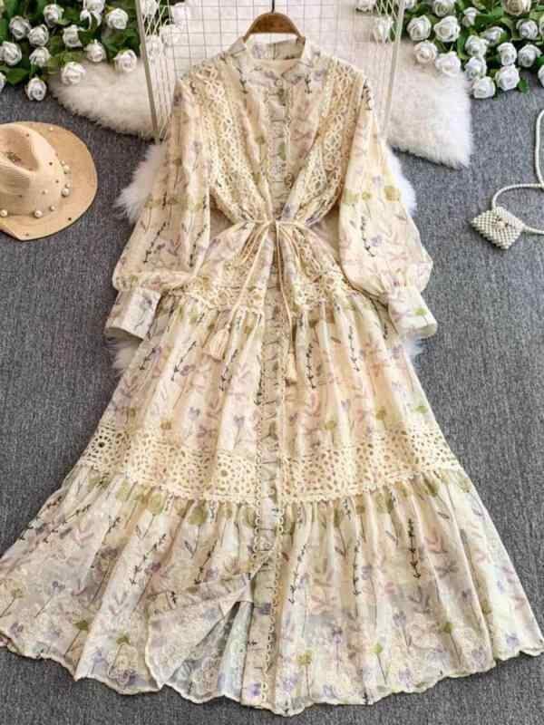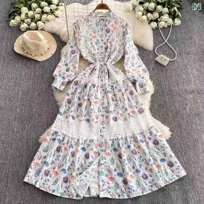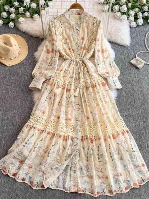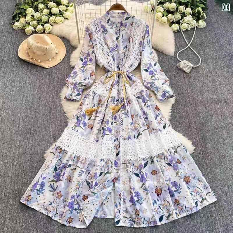 ワンピース レディース フレンチレトロ 宮廷風 レース切り替え ランタンスリーブ ウエストマーク シングルボタン リボン 長袖 ロングワンピース 抽象柄 プリント Aライン スタンドカラー ポリエステル 通勤 オフィス 上品 春夏