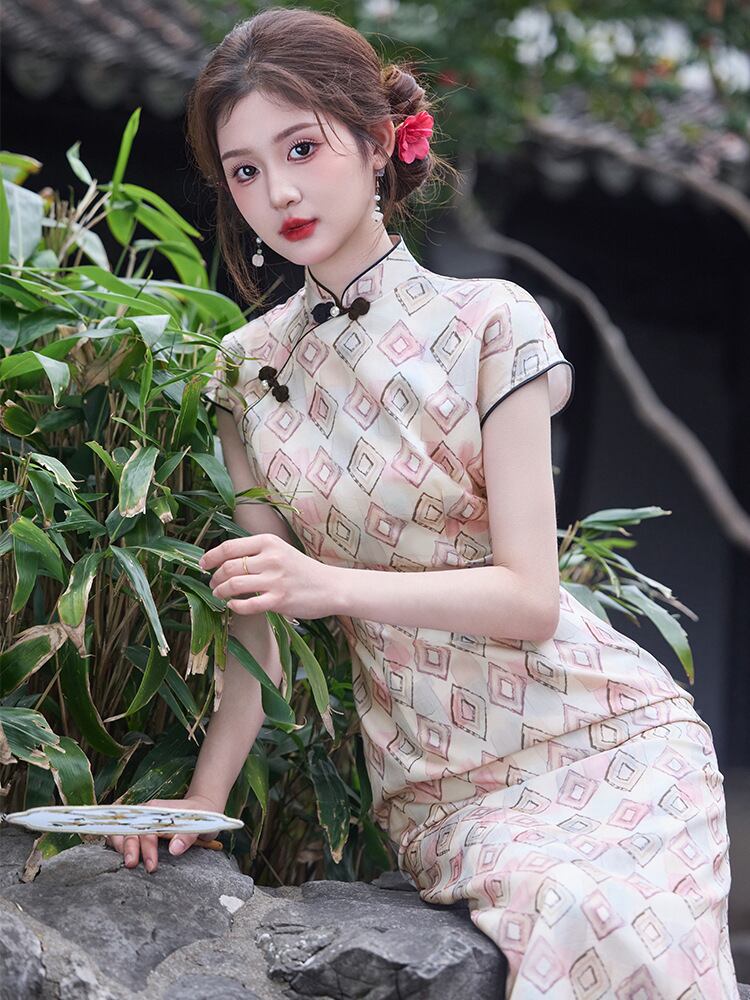 チャイナドレス レディース ワンピース モダン 新中華風 ネオチャイニーズ サテン ロング丈 一体袖 チーパオ 春夏 少女向け ガーリー ガーリー プリント柄 二重仕立て ダブルレイヤー