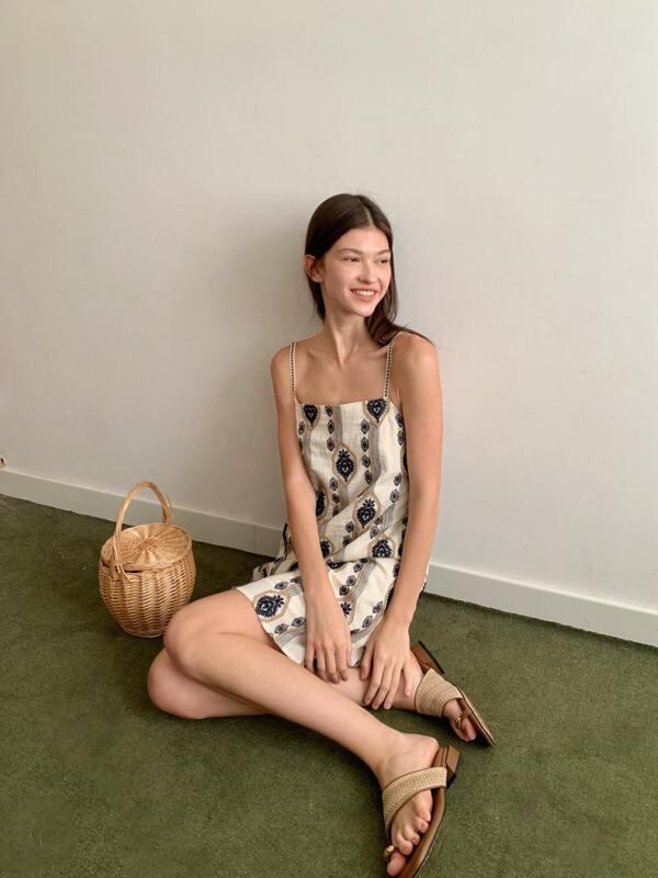 ワンピース ボヘミアン 立体刺繍 キャミソール 綿 コットン 幾何学柄 ミディ丈 ゆったり ノースリーブ 夏 サマー リゾート アプリコット カジュアルスタイル 切り替え