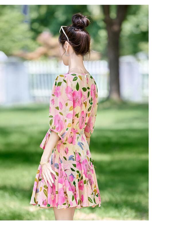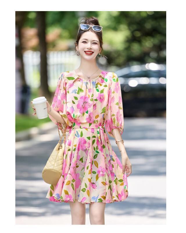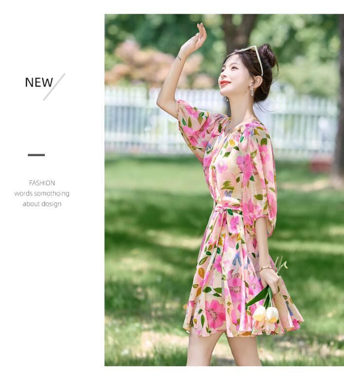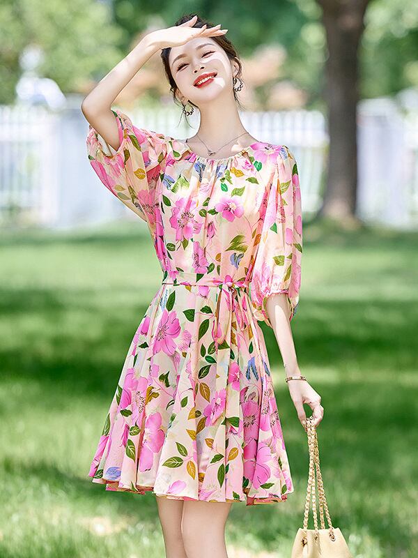 ワンピース レディース 半袖 ウエストシェイプ 着痩せ効果 Aライン ミモレ丈 花柄 プリント エレガント 通勤 オフィス カジュアル 春夏 爽やか クルーネック ポリエステル ウエストリボン