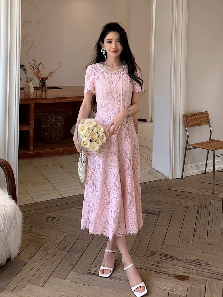 ワンピース レディース ピンク パール装飾 ラウンドネック 半袖 レース スリムフィット ロング丈 Aラインドレス 宴会 結婚式 お呼ばれ フォーマル 旅行 リゾート 春夏