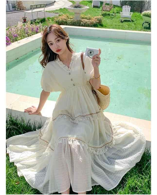 ワンピース レディース ベージュ 春夏 フレンチレトロ リゾートスタイル フェミニン かわいい フリルネック Vネック 半袖 Aライン ロング丈 ウエストゴム カジュアル