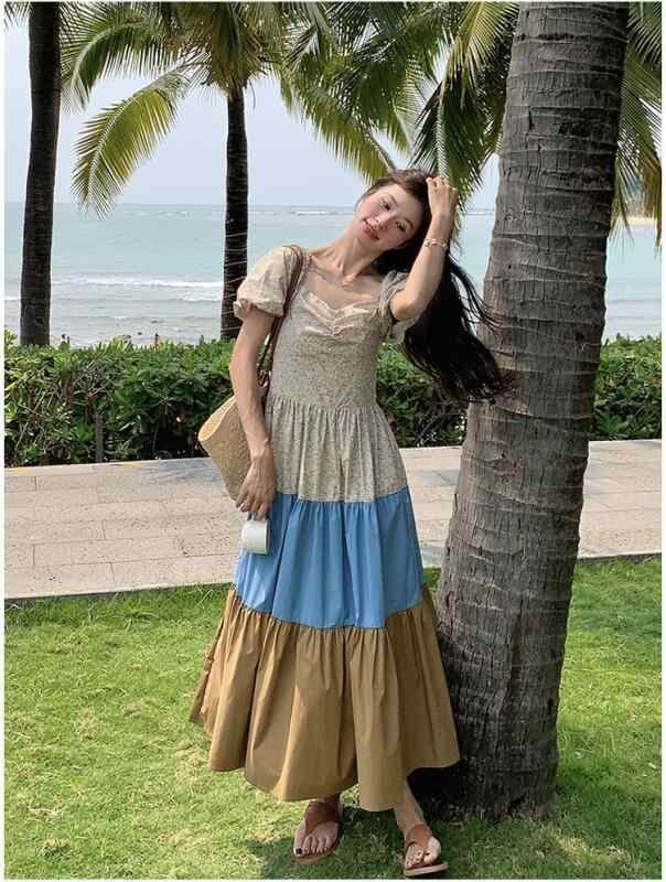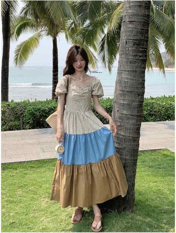 ワンピース レディース フレンチ リゾートスタイル コントラストカラー ロング丈 Aライン フレアスカート スクエアネック パフスリーブ 半袖 ハイウエスト ポリエステル 上品 春夏