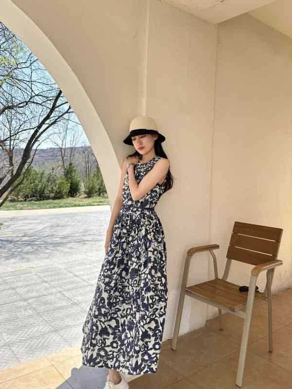 ワンピース レディース 綿 ポプリン 花柄プリント ノースリーブ ウエストベルト ミディ丈 スタイルアップ 上品 エレガント Aライン 春夏 リゾート