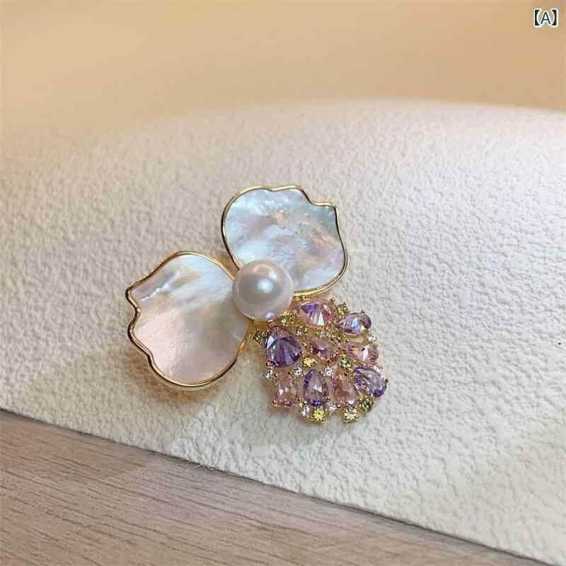 ブローチ レディース 天然シェル マザーオブパール 三弁花 花モチーフ 高級感 個性的 ラグジュアリー エレガント 上品 華やか 存在感 銅製 クリスタル装飾 春夏 ファッション 通勤 オフィス 服飾小物 アクセサリー