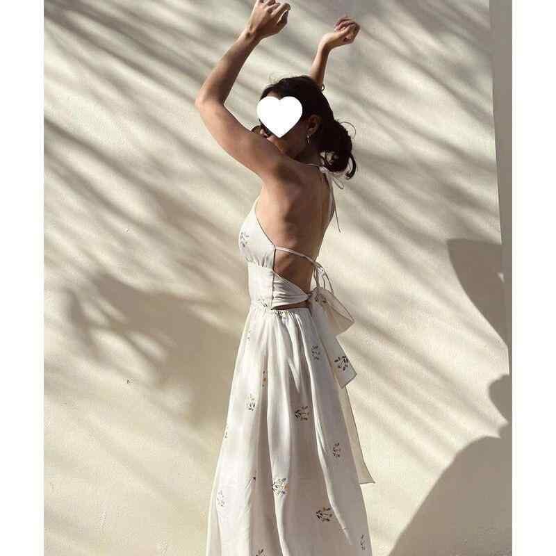 ワンピース レディース キャミソール ホルターネック オープンバック ロング丈 小花柄 ウエストマーク 細見え フレンチスタイル 高級感 春夏 ノースリーブ Aライン レトロ エレガント