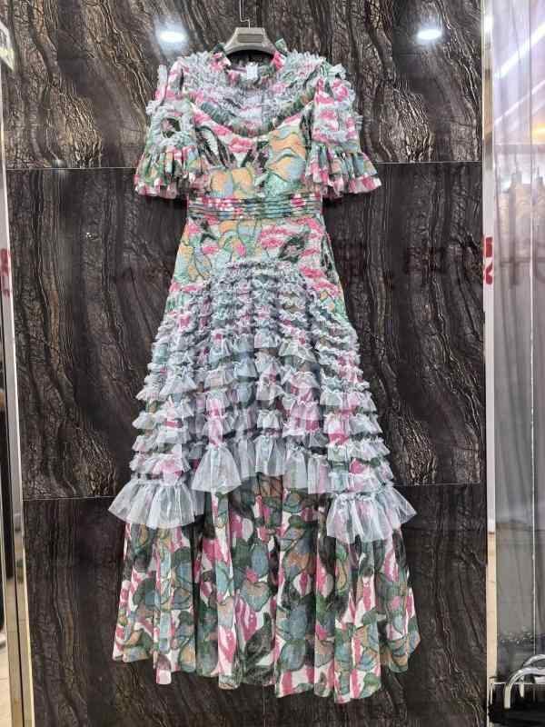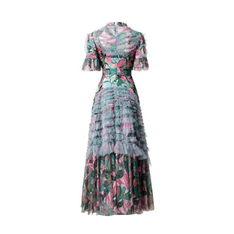 ワンピース レディース 春夏 フレンチスタイル エレガント 上品 花柄 ロング丈 細見え ハイウエスト シアー 切り替え パフスリーブ リゾート ビーチ 通勤ドレス