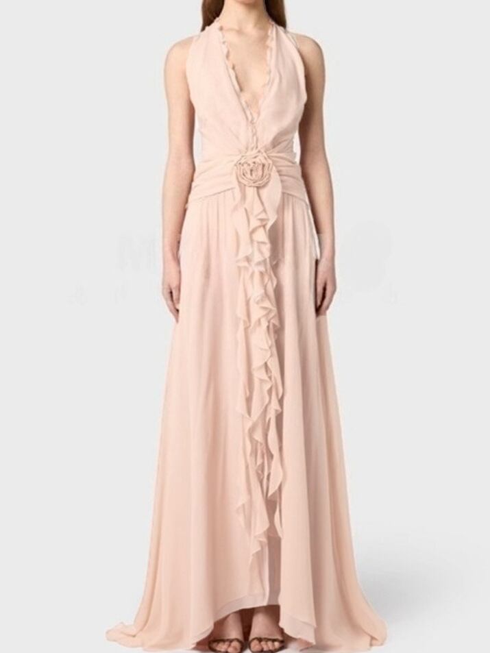 ワンピース レディース 春夏 エレガント セクシー ホルターネック フリル プリーツ 立体フラワー Aライン Vネック ノースリーブ ロング丈 個性的 名媛風 ポリエステル 綿 アプリコットピンク