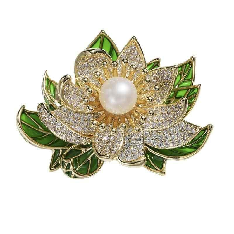ブローチ レディース 中国風 吉祥 蓮花 淡水パール モチーフ 個性的 上品 高級感 銅製 エナメル加工 グリーン レトロ フォーマル カジュアル ギフト プレゼント