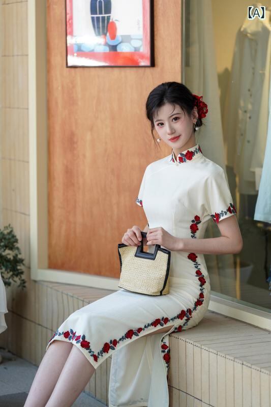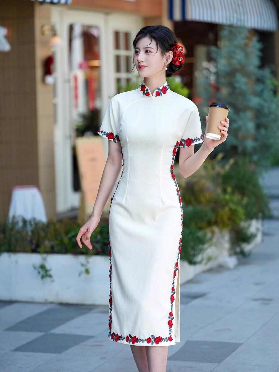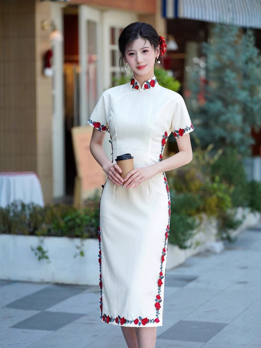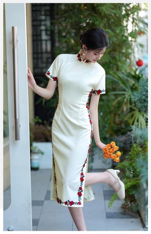 チャイナドレス レディース 春夏 改良 普段使い 上品 スリムフィット 微ストレッチ ワンピース アイボリー ロング丈 スタンドカラー 斜め襟 半袖