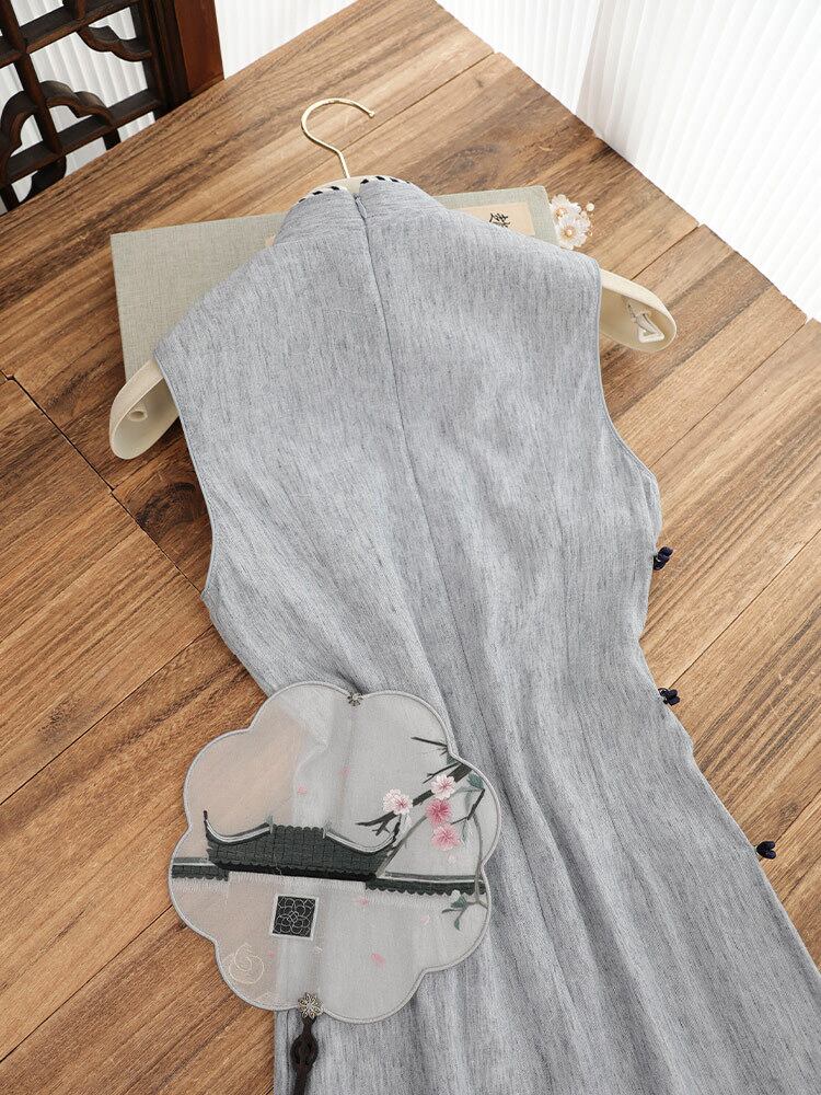チャイナドレス レディース グレー ノースリーブ レトロモダン 新古典 ロング丈 ロースリット スタンドカラー 斜め襟 シック エレガント デイリーユース 春夏