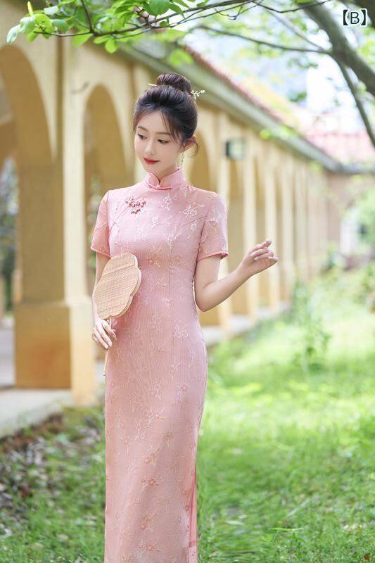 ワンピース レディース 日常使い スリムフィット ミモレ丈 改良型 チャイナドレス 新チャイナ風 上品 エレガント 半袖 スタンドカラー ストレッチ素材 光沢素材 立体模様 ミドルスリット フェミニン 春夏
