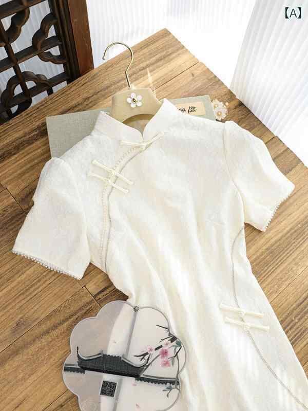 チャイナドレス レディース 女性用 半袖 新チャイナスタイル エレガント 上品 レトロ 中国風 立襟 斜め襟 スリット 普段使い カジュアル ポリエステル 綿 アイボリー 春夏