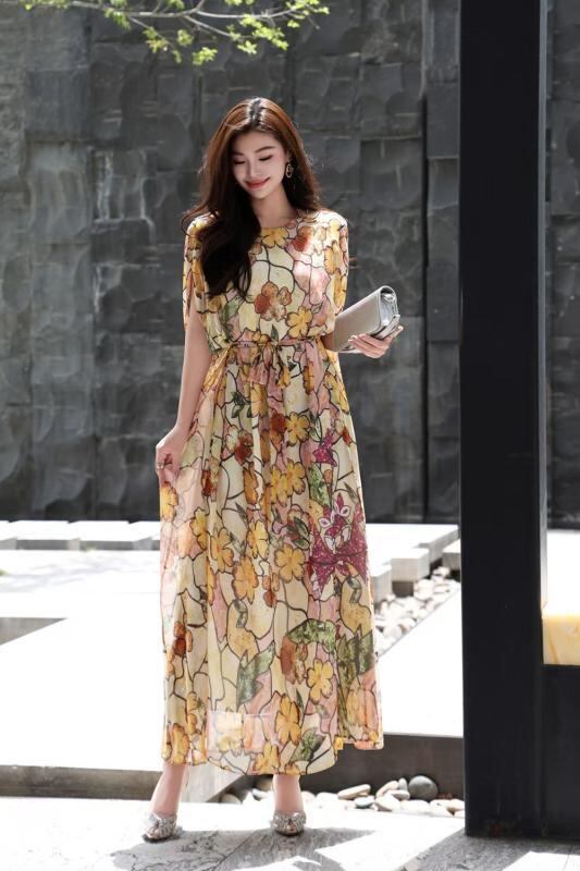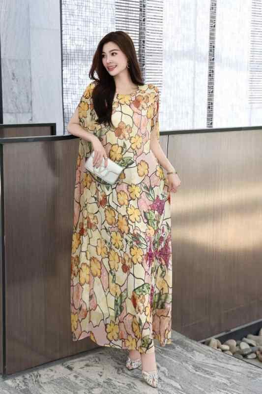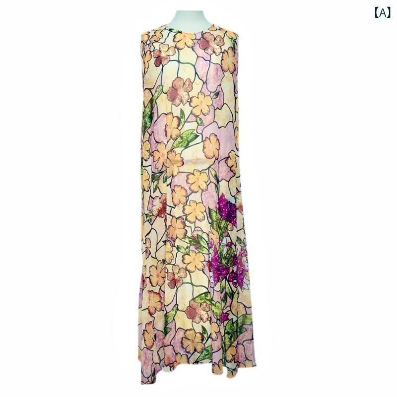 ワンピース レディース 春夏 ラウンドネック ノースリーブ ケープ風 フレンチレトロ カレイドスコープ柄 プリント ジョーゼット リゾート ビーチ エレガント ロング丈 通勤