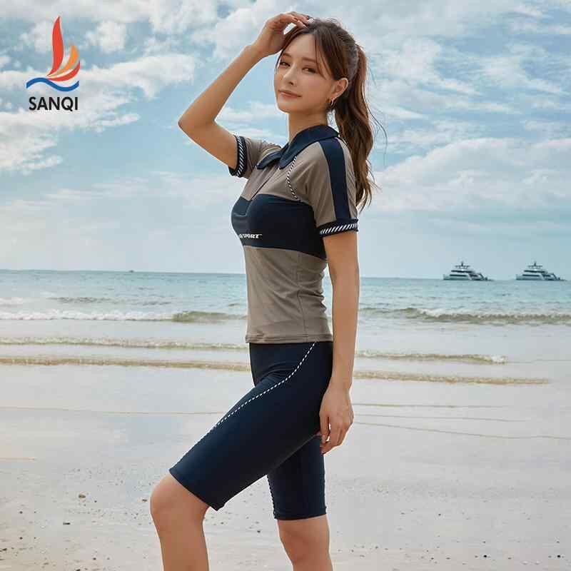 水着 レディース セパレート 体型カバー お腹カバー 着痩せ 無地 ポロ襟 半袖 カップ付き ノンワイヤー ナイロン スポーツ スイミング プール用 紺色