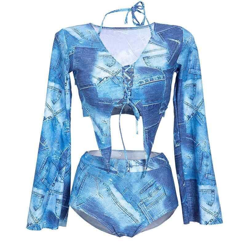 水着 レディース セパレート ビキニ 3点セット 長袖 UVカット ワイヤー入り パッド付き 体型カバー セクシー 純欲 高級感 インフルエンサー 温泉 リゾート ナイロン ポリエステル デニムブルー 春夏