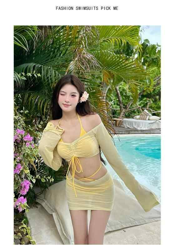 ビキニ レディース 長袖 セパレート 水着 4点セット 黄色 体型カバー 着痩せ 日焼け防止 温泉 旅行 ビーチ プール 海水浴