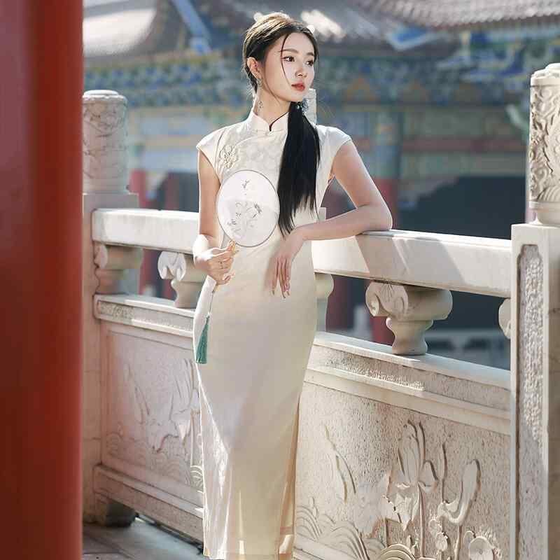 チャイナドレス レディース 女性用 白 ノースリーブ ロング丈 改良型 中国風 中華風 レトロ ヴィンテージ ラウンドネック サテン風 普段使い 日常着 夏