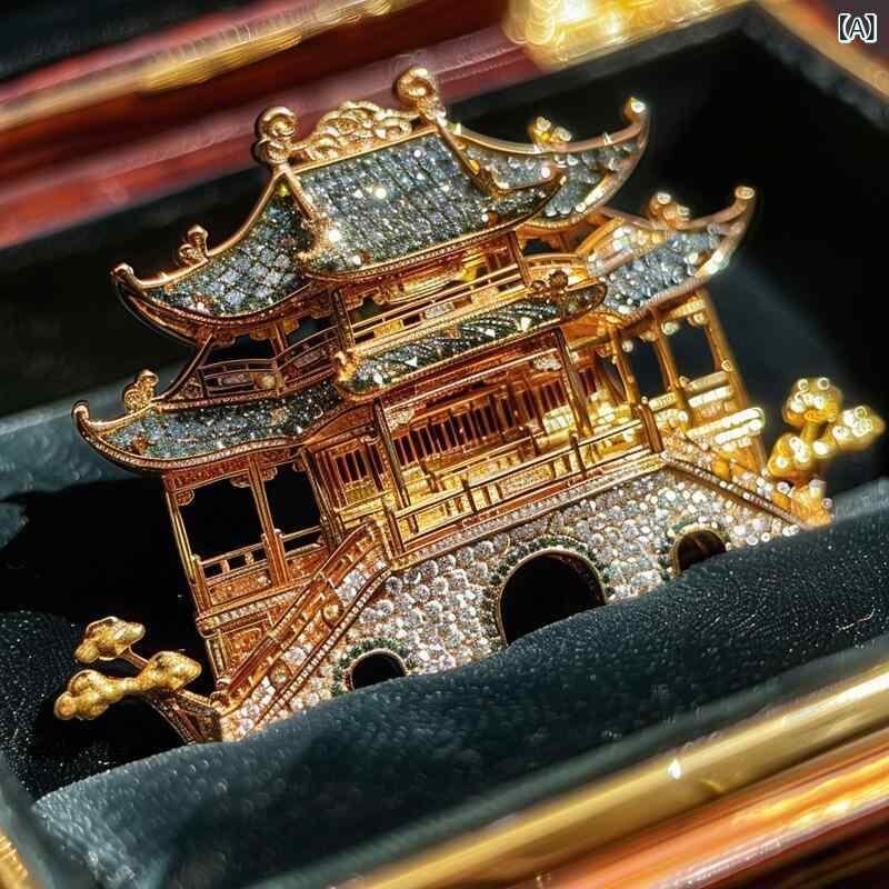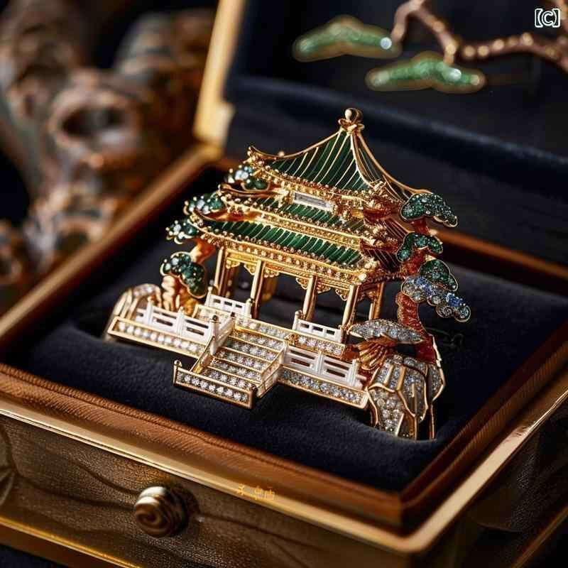 ブローチ 男女兼用 高級感 エレガント オリジナルデザイン ジルコニア 銅製 復古 中国古典風 楼閣モチーフ 幾何学デザイン 電気メッキ加工 多機能 装飾