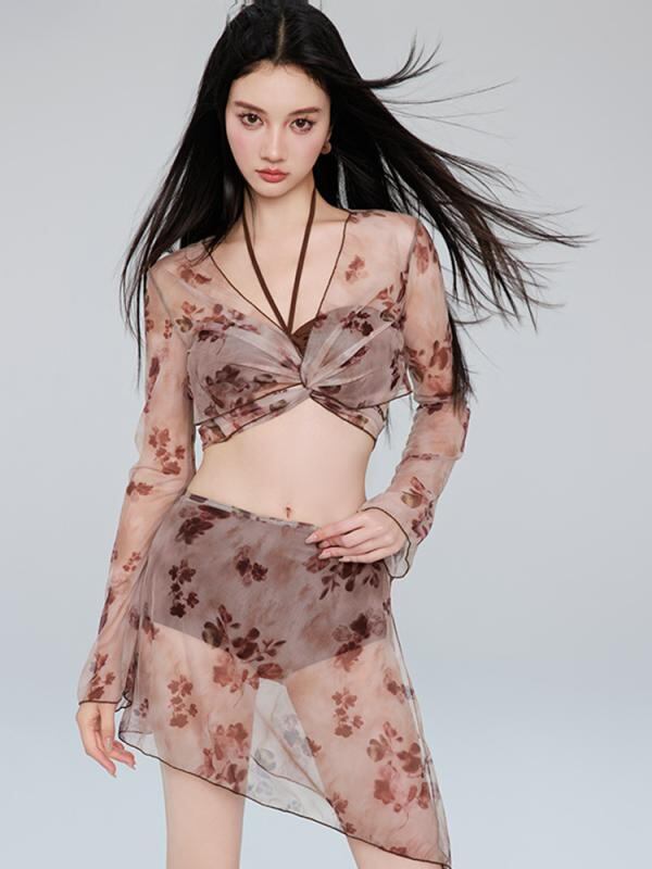 水着 レディース レトロ 純欲 セクシー セパレート ビキニ カバーアップ 4点セット 長袖 パッド付き ワイヤーなし 速乾 高伸縮性 カーキ ビーチ リゾート 温泉 プール 旅行 夏 スイムウェア