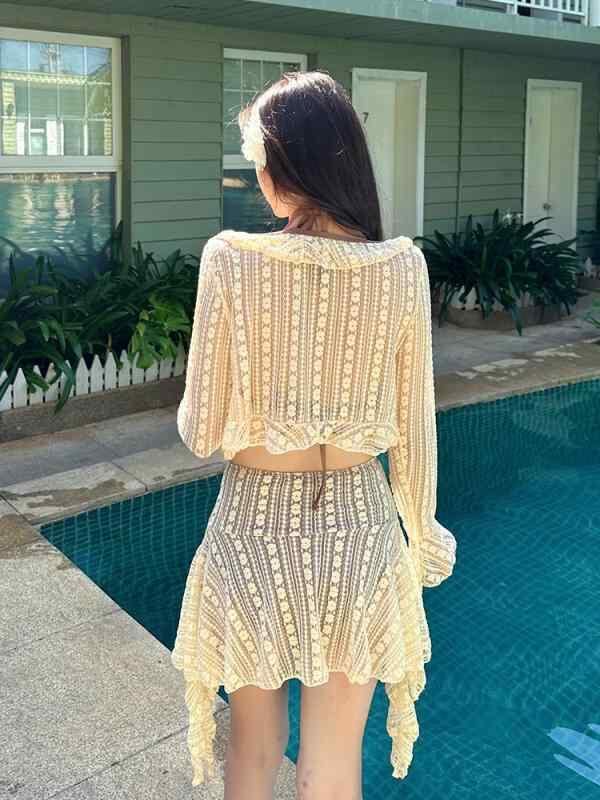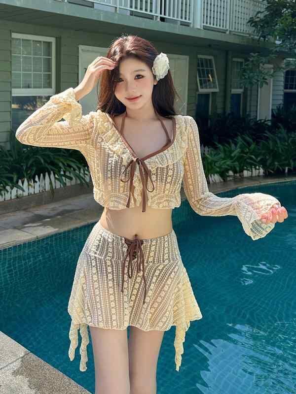 水着 レディース レトロ セパレート ビキニ 3点セット スカート付き カップ付き ノンワイヤー 体型カバー UVカット レース ベージュ 夏 プール 海 リゾート