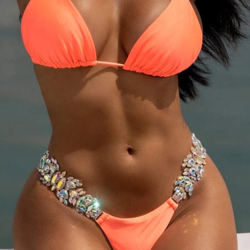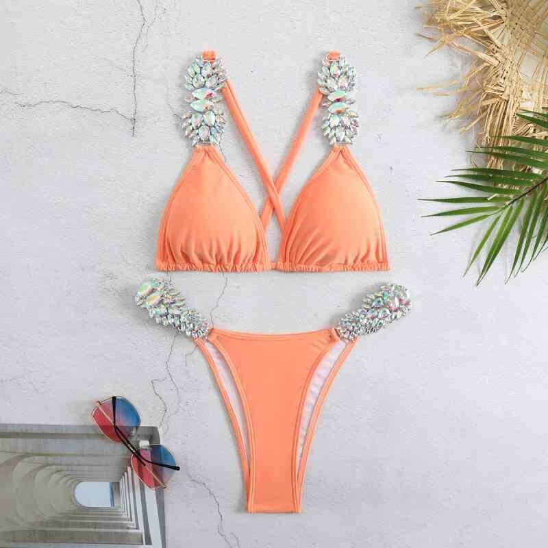 水着 レディース 三角ビキニ セクシー ラインストーン クロスストラップ セパレート 2点セット パッド入り ノンワイヤー 背中開き オレンジ ポリエステル 欧米風 リゾート 夏