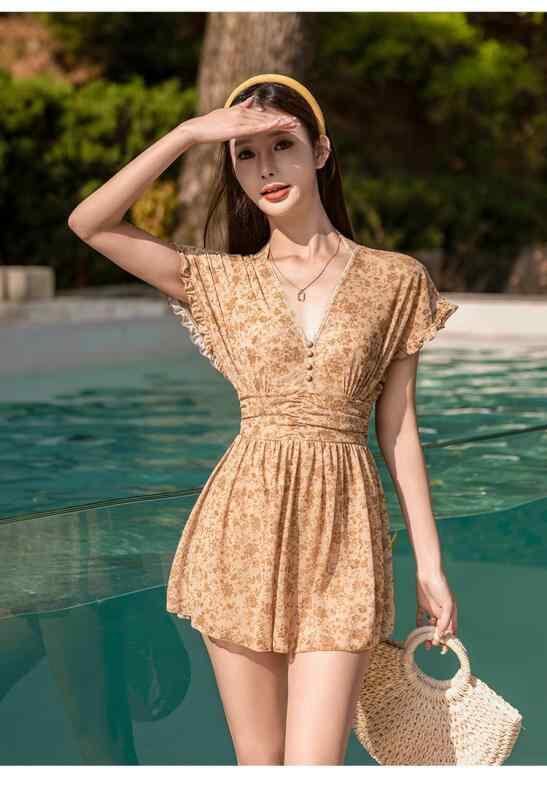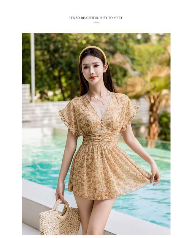 水着 レディース ワンピース水着 体型カバー 半袖 花柄 黄色 イエロー 体系カバー 聚拢 紧身 細見え 耐久性 接触冷感 ポリエステル 游泳 涉水 海水浴 プール
