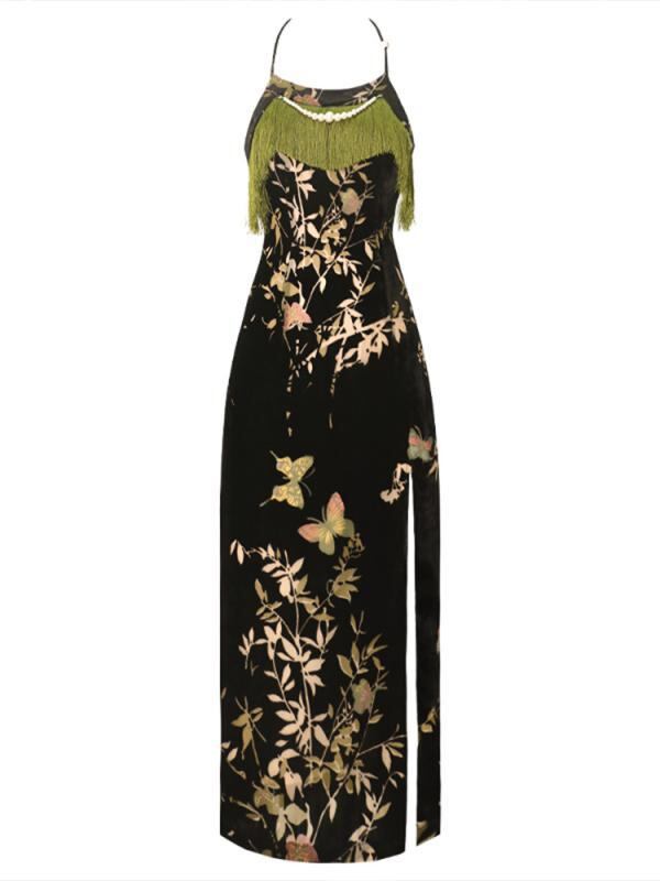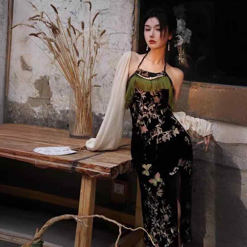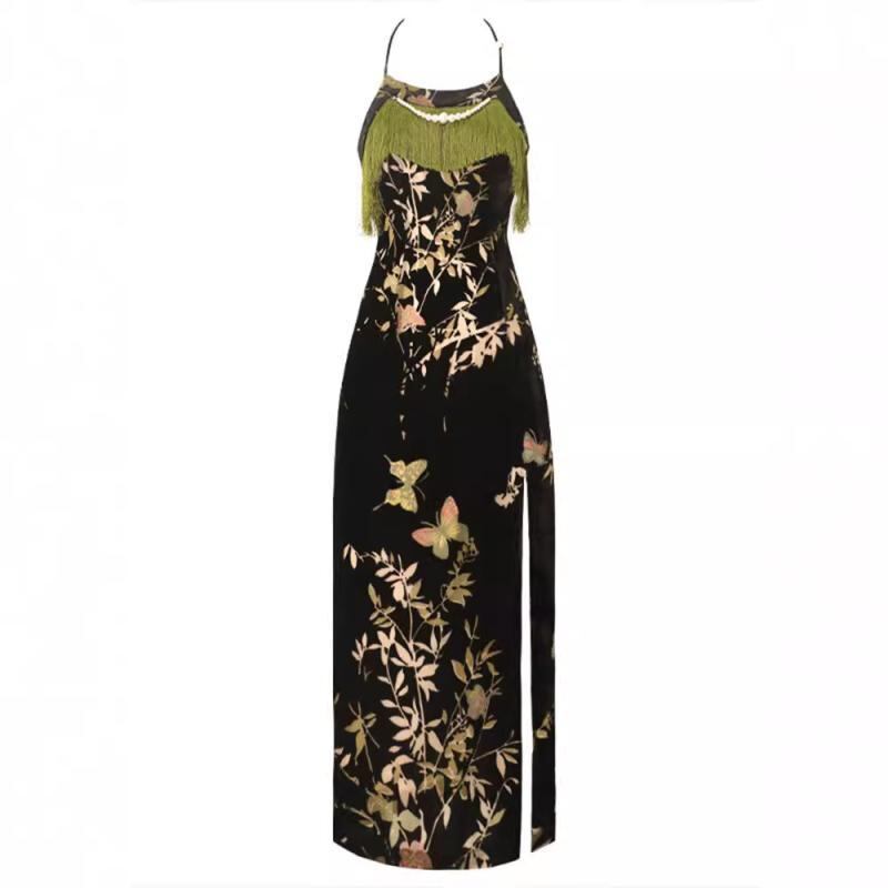 チャイナドレス レディース 新中国風 改良型 ホルターネック キャミソールワンピース 薄手 ベルベット 花柄 フリンジ ロング丈 エレガント レトロ ポリエステル 夏