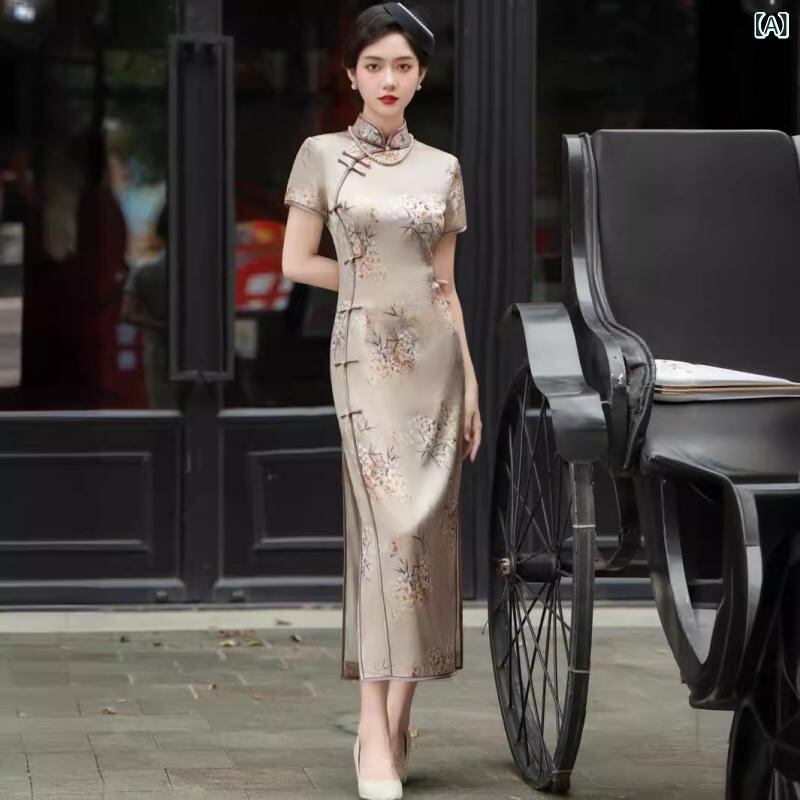 チャイナドレス レディース 高級感 桑蚕シルク シルク混 ストレッチ 立体柄 ロング丈 春夏 レトロ モダン 中国風 ワンピース パーティードレス 立ち襟 斜め前開き スリット