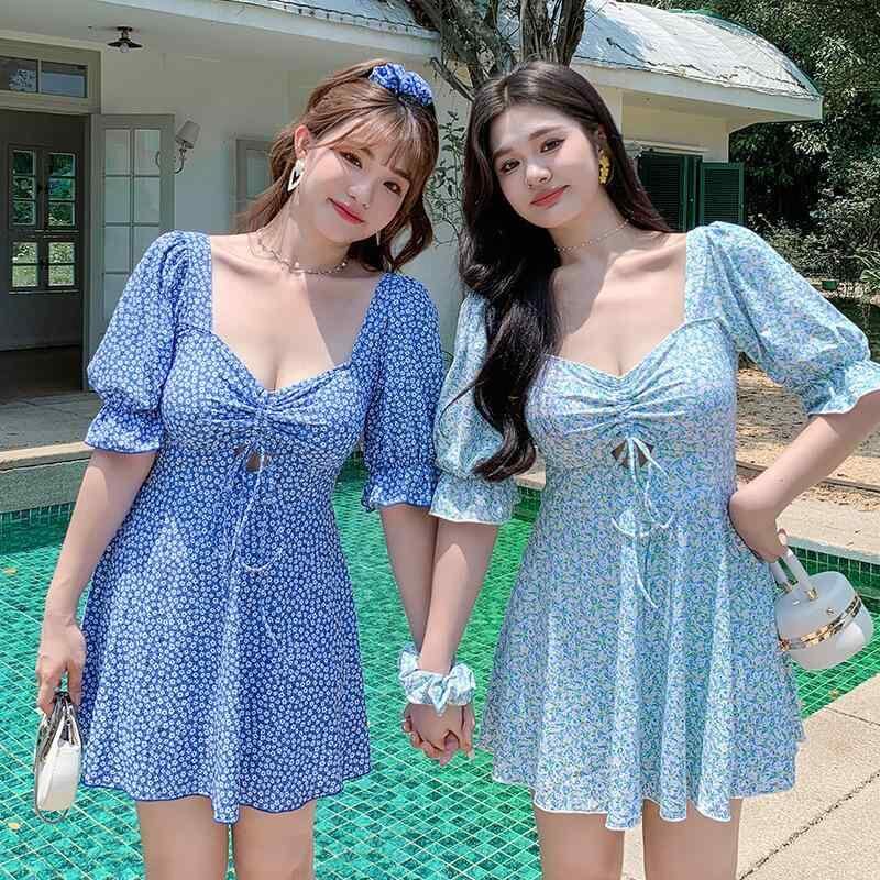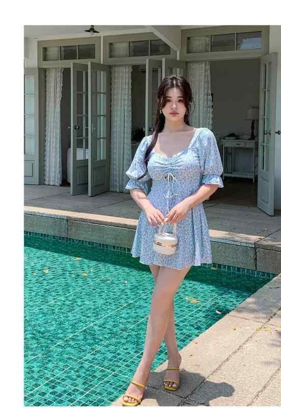 水着 レディース 大きいサイズ ワンピース 花柄 体型カバー お腹カバー ワイヤー入り 韓国風 かわいい 学生 プール ビーチ 海 マリンスポーツ ナイロン スパンデックス ブルー系 イエロー系