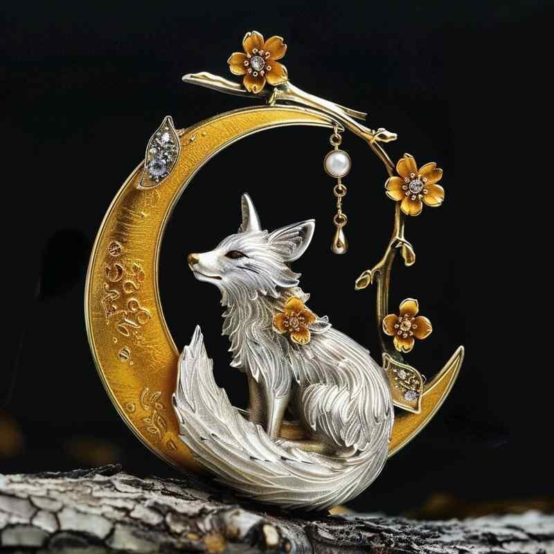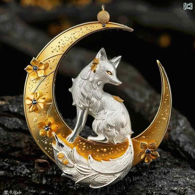 ブローチ レディース 月 狐モチーフ オリジナルデザイン 精巧細工 レトロ アンティーク 中古風 銅 パール付き 高級感 クール 個性的 秋冬