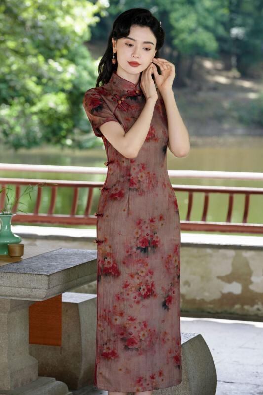 チャイナドレス レディース 女性用 スリムフィット レトロ エレガント 上品 ロング丈 長袖 ポリエステル スタンドカラー スリット 春夏 レッド系 パーティードレス フォーマル