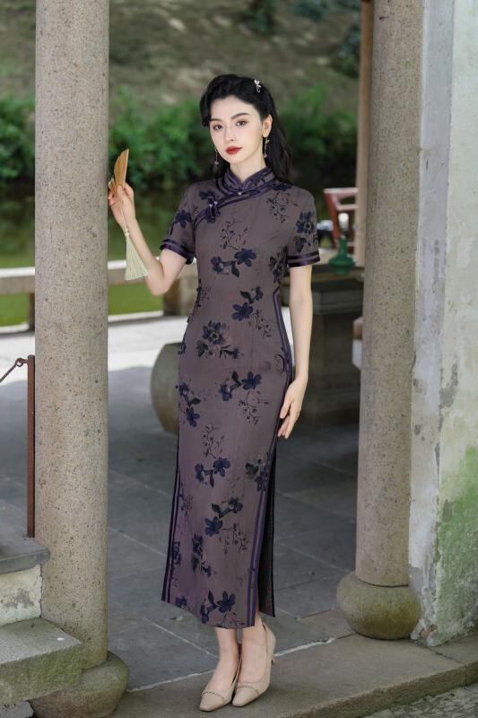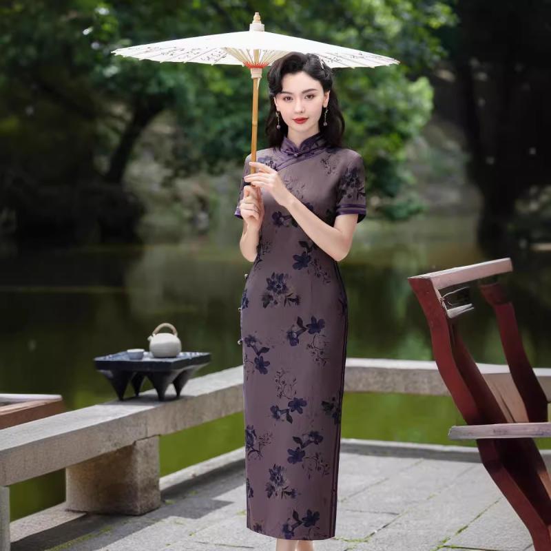 チャイナドレス レディース チャイナ風 スリムフィット レトロ クラシカル おしゃれ 上品 エレガント ロング丈 長袖 スタンドカラー ハイウエストスリット ポリエステル アセテート 春夏 フォーマル パーティー