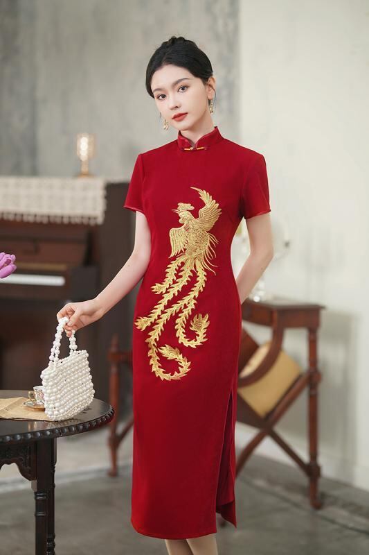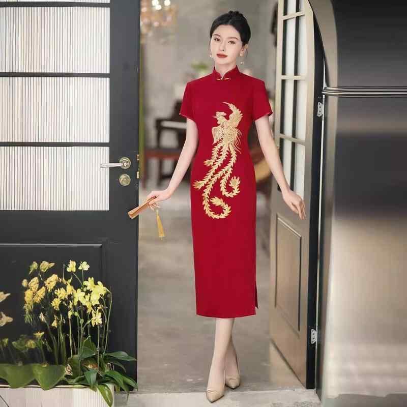 チャイナドレス レディース 春夏 中国風 アセテートサテン風 赤色 刺繍 花柄 ミディ丈 スタンドカラー 七分袖 レトロ パーティー イベント お祝い