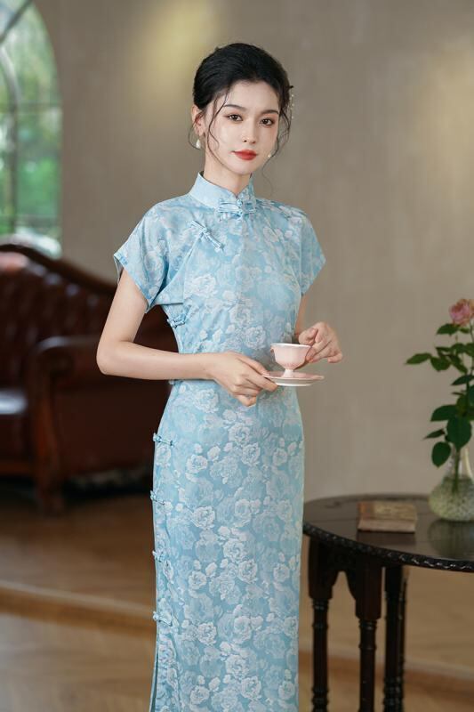 チャイナドレス レディース 春夏 中国風 シルク調 ストレッチ ジャガード織り ロング丈 開襟 スタンドカラー 五分袖 スリット入り レトロ ガーリー 上品 エレガント ワンピース
