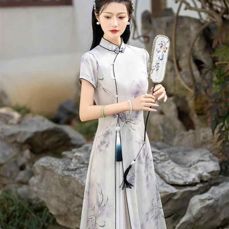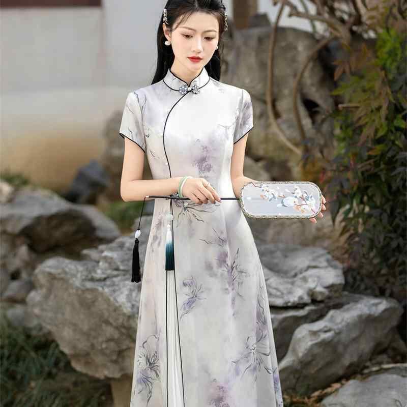 チャイナドレス レディース 大人 アオザイ風 ワンピース シンプル 改良デザイン 淡色 新チャイナ風 エレガント 上品 レトロ ミドル丈 ポリエステル スパンデックス 伸縮性 スタンドカラー 半袖 五分袖 三分袖 スリット入り 春夏
