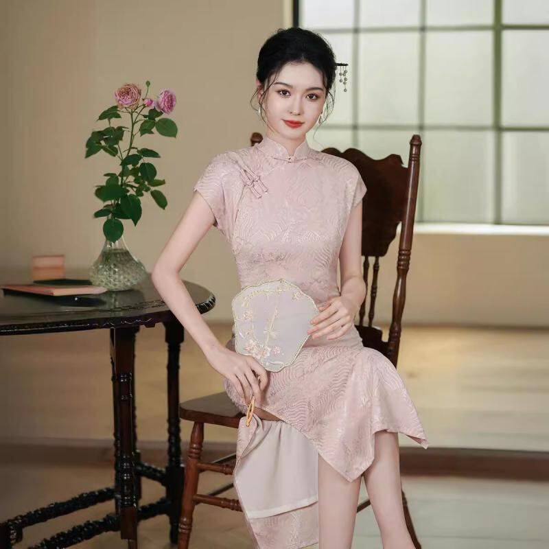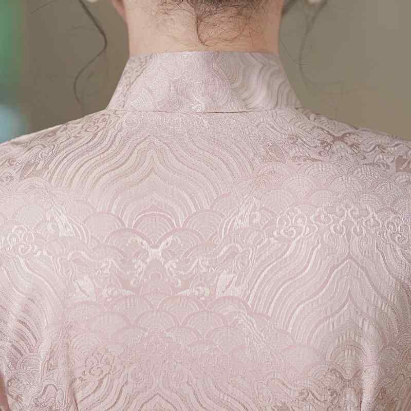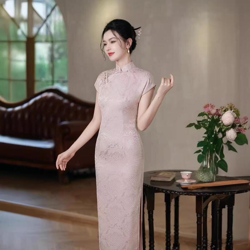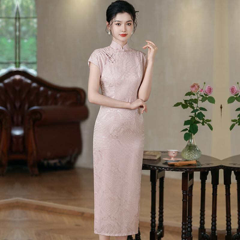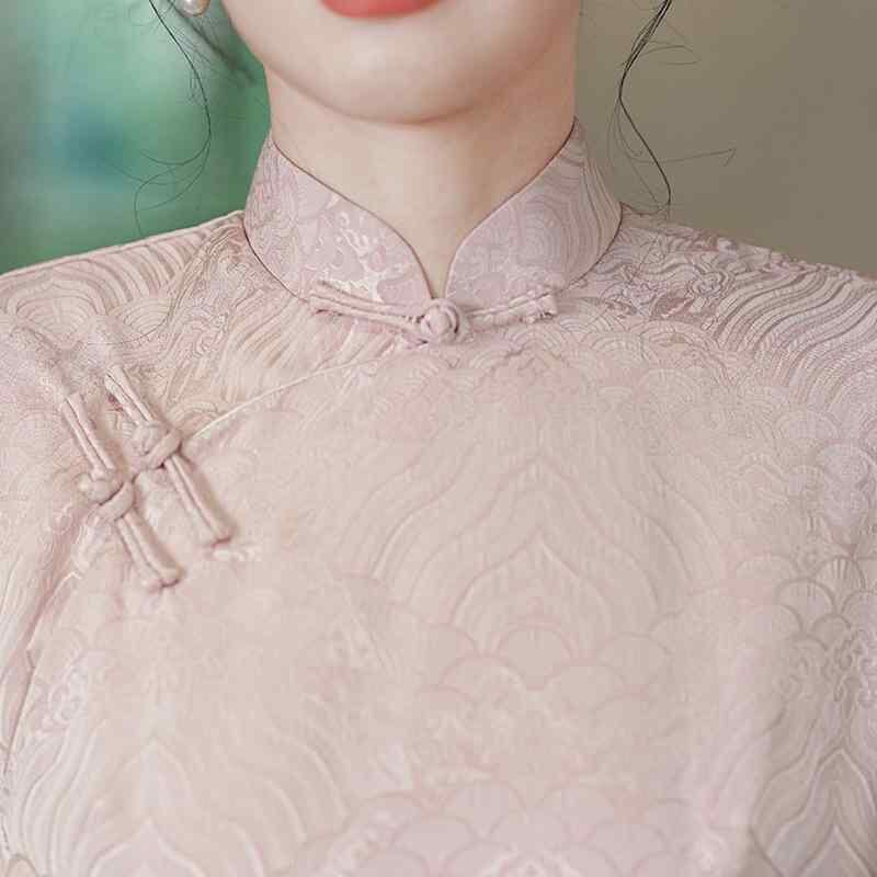 ワンピース レディース チャイナドレス 前開き ロングワンピース レトロ 中国風 模造アセテートジャカード 細見え スタンドカラー 七分袖 スリット エレガント 春夏