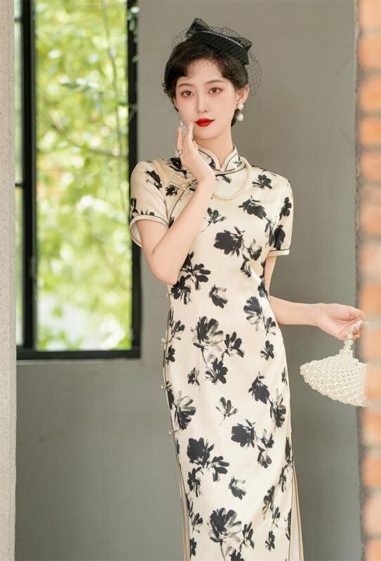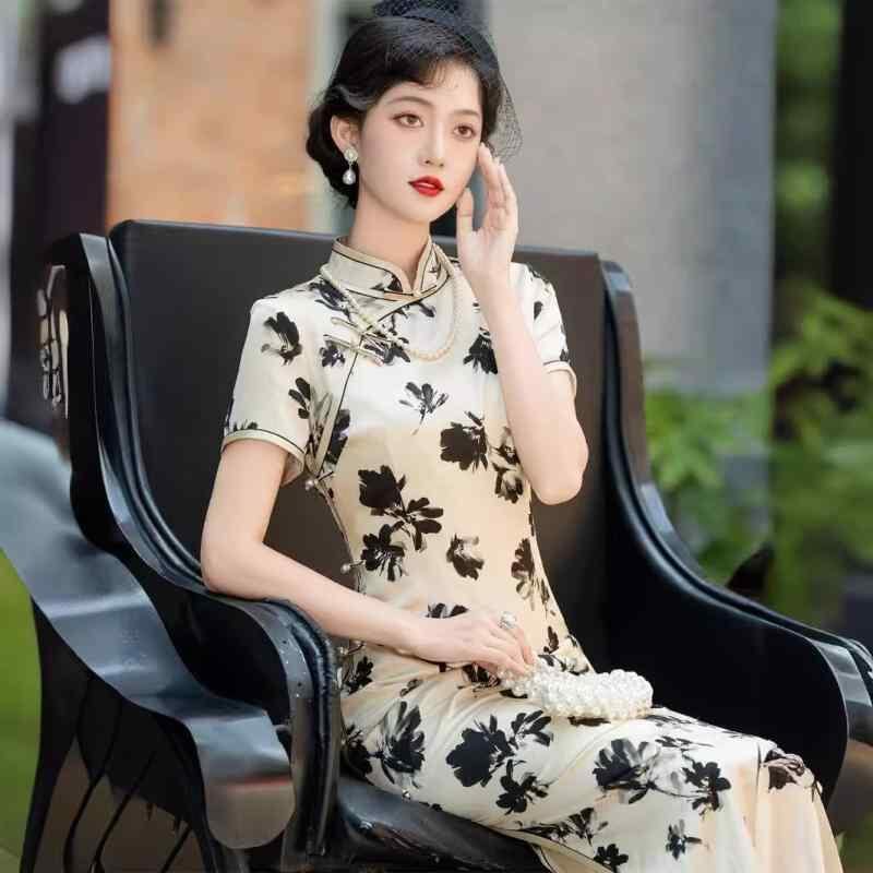 チャイナドレス レディース 桑蚕シルク 高級感 モダンチャイニーズ 水墨柄 ロング丈 ワンピース 立襟 斜め襟 半袖 微弾性 スリット エレガント 春夏