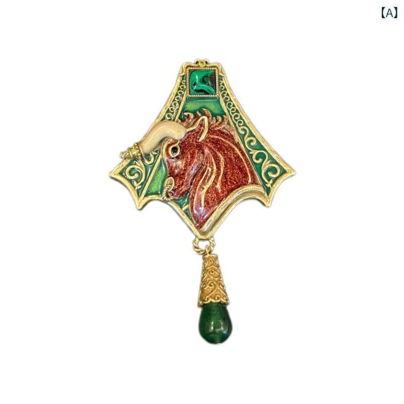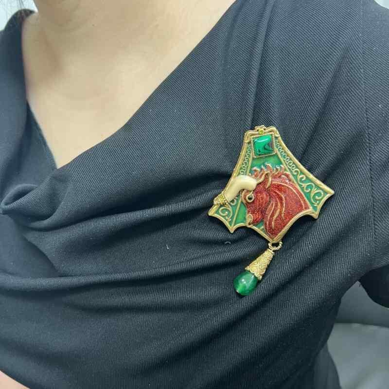 ブローチ レディース 新チャイナ風 国風 レトロ 重厚感 牛モチーフ 合金 電気メッキ加工 エナメル 七宝 瑠璃 ガラス タッセル 高級感 ファッション小物 グリーン