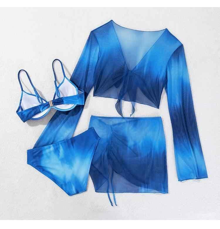 水着 レディース ビキニ 4点セット 小胸さん向け ワイヤー入り パッド入り 高級感 セパレート ビーチ リゾート 旅行 春夏 速乾 高伸縮性 長袖 バックシャン ショーツ ブルー ナイロン ポリエステル スパンデックス