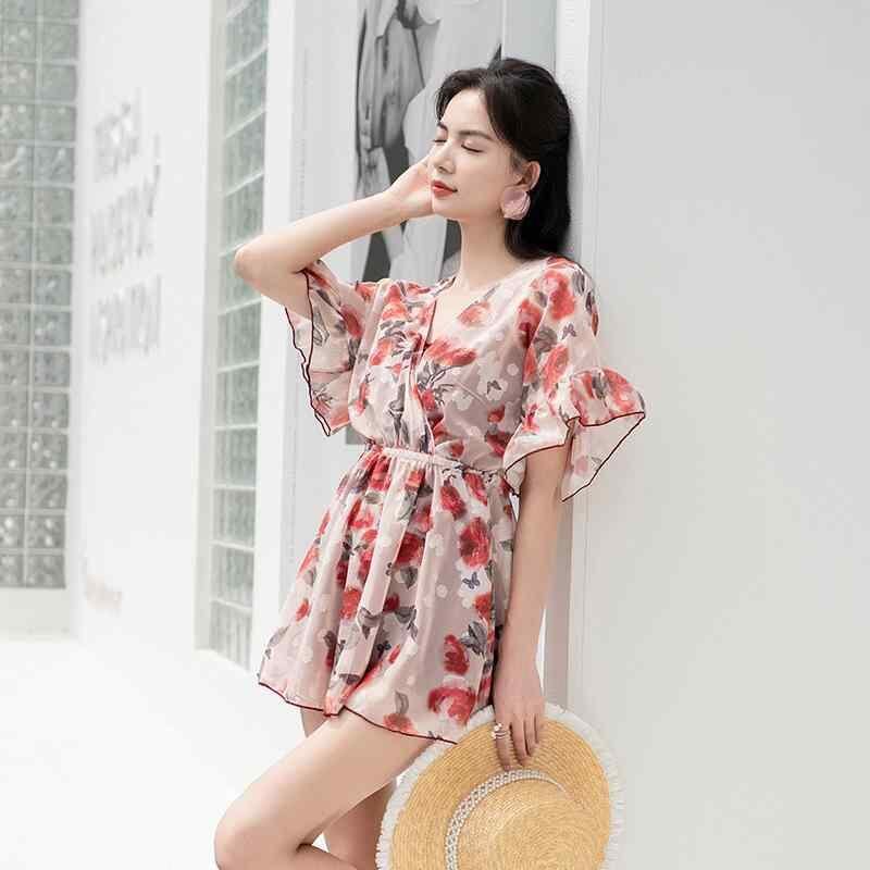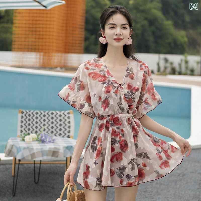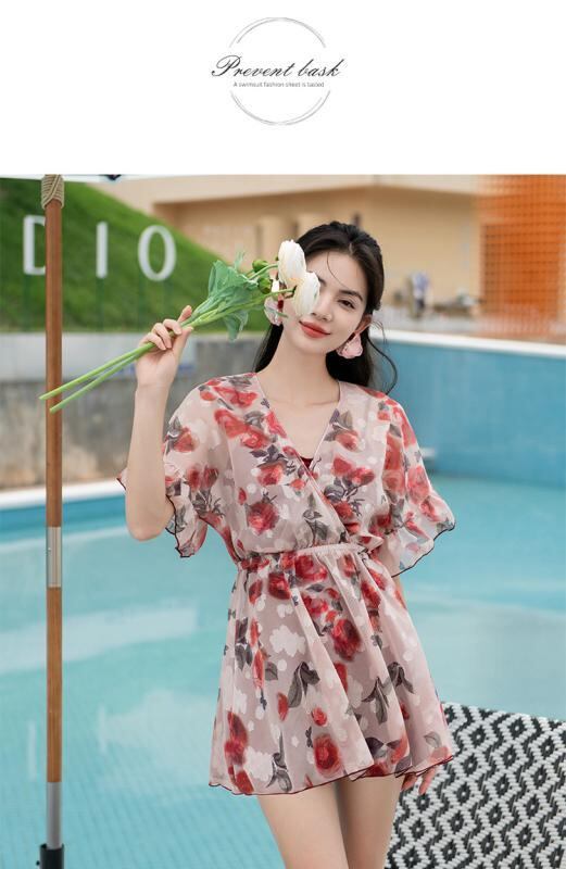 水着 レディース 3点セット ビキニ ショートパンツ カバーアップ 体型カバー バストアップ ワイヤー入り パッド入り 小胸向け 温泉 プール ビーチ リゾート かわいい レッド花柄 春夏