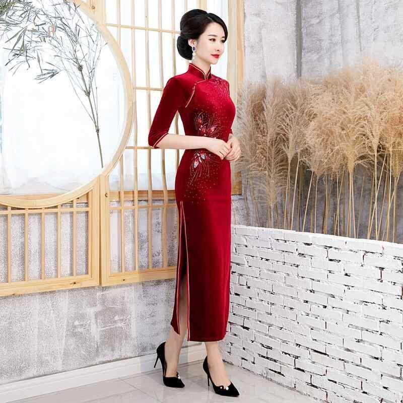 チャイナドレス レディース ベロア ロング丈 七分袖 スパンコール ビーズ装飾 大きいサイズ ゆったり ミセス 普段使い フォーマル 宴会 結婚式 パーティー ドレス スタンドカラー スリット ポリエステル 高級感