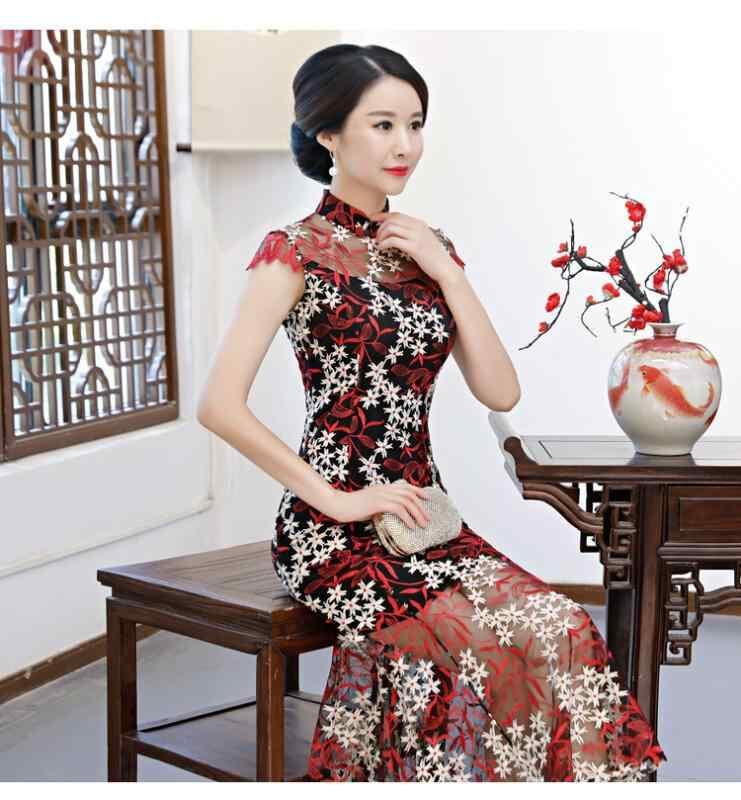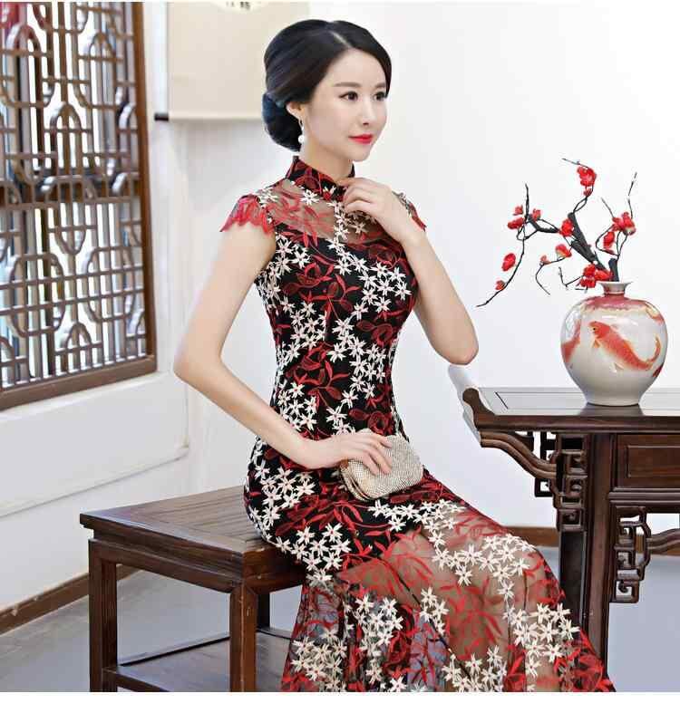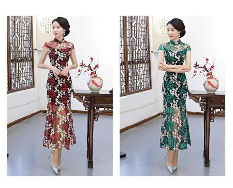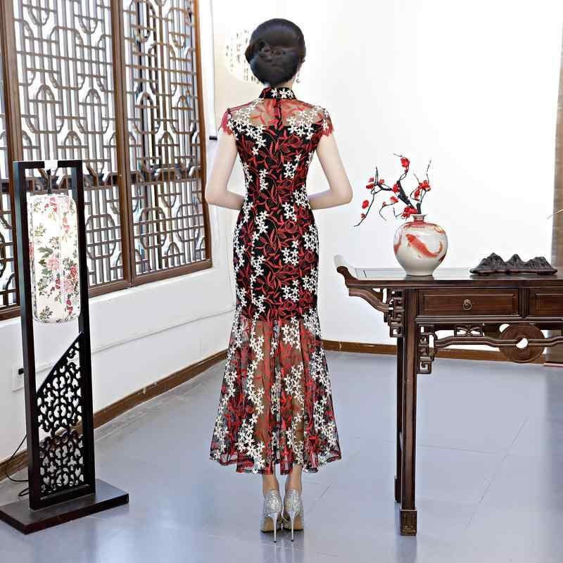 チャイナドレス レディース ロングワンピース レース 刺繍 マーメイド フォーマル パーティードレス ステージ衣装 発表会 演奏会 結婚式 披露宴 立襟 ショートスリーブ スリット レッド グリーン ポリエステル 再生繊維 春夏秋