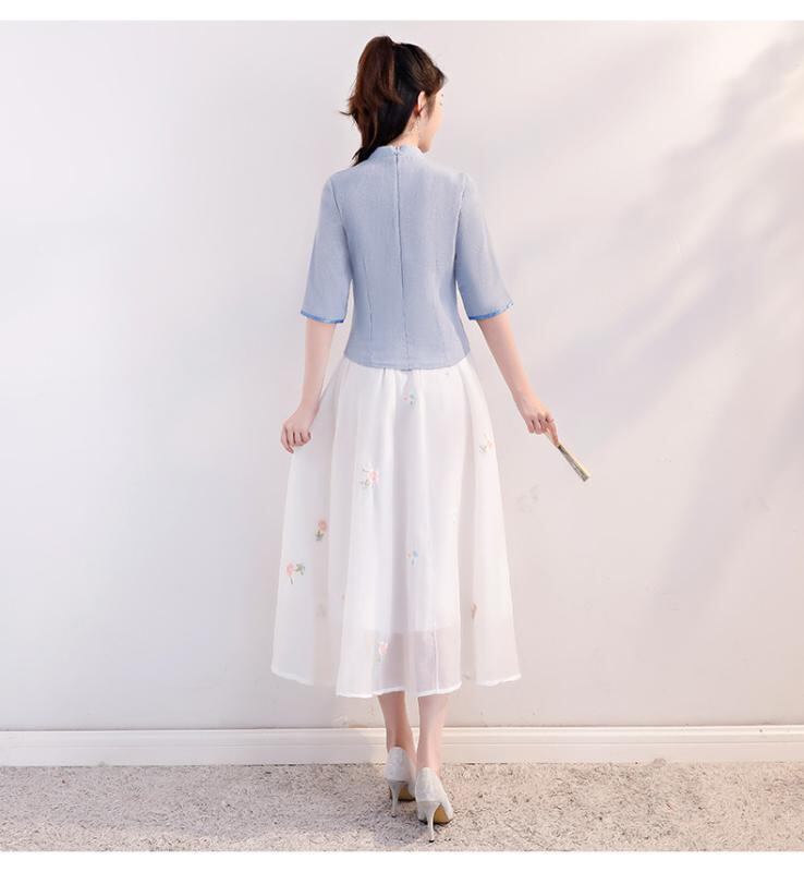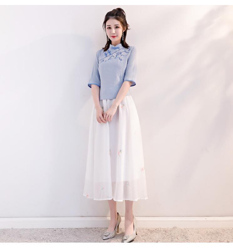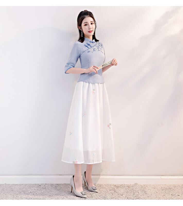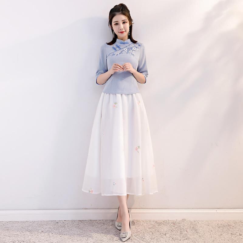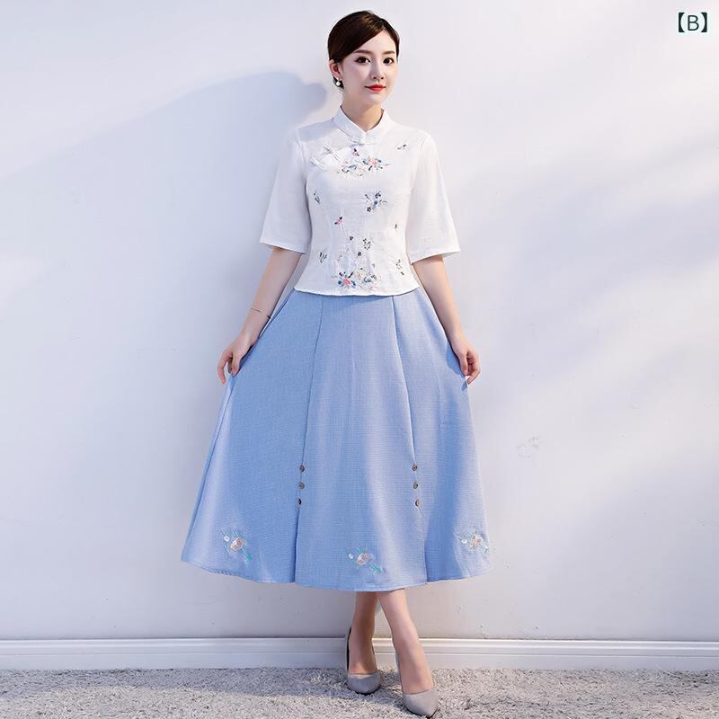 チャイナドレス レディース スリムフィット 九分袖 大正ロマン風 レトロモダン 春夏 綿麻 トップス ブラウス 立襟 斜め前開き ピンク ブルー 刺繍 漢服