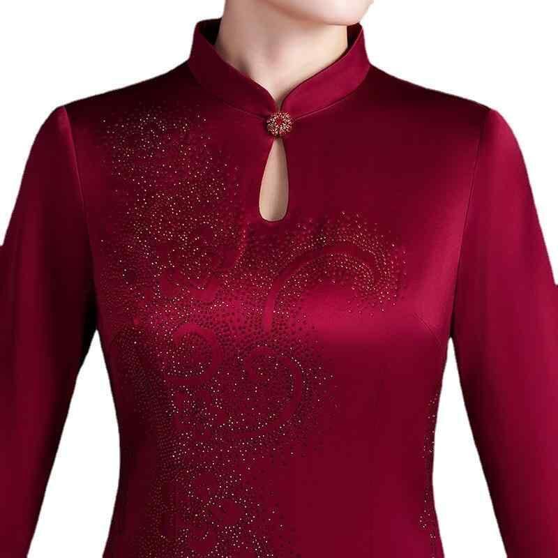 ワンピース レディース ママ 酢酸サテン 七分袖 チャイナ服 結婚式 披露宴 フォーマルドレス 礼服 パーティー お呼ばれ スタンドカラー ロング丈 ストレッチ ワインレッド ラインストーン 春夏
