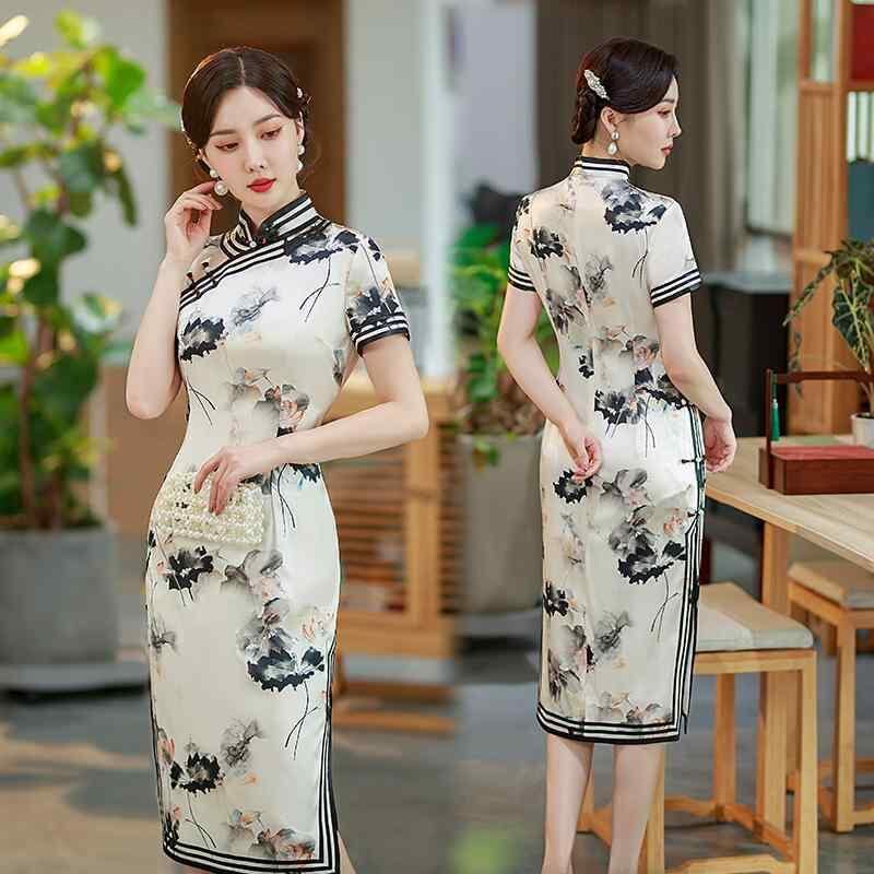 チャイナドレス レディース 桑蚕シルク 手作り 蓮の花柄 上品 エレガント ミディ丈 半袖 スタンドカラー 着痩せ 体型カバー 普段使い 春夏 ストレッチ
