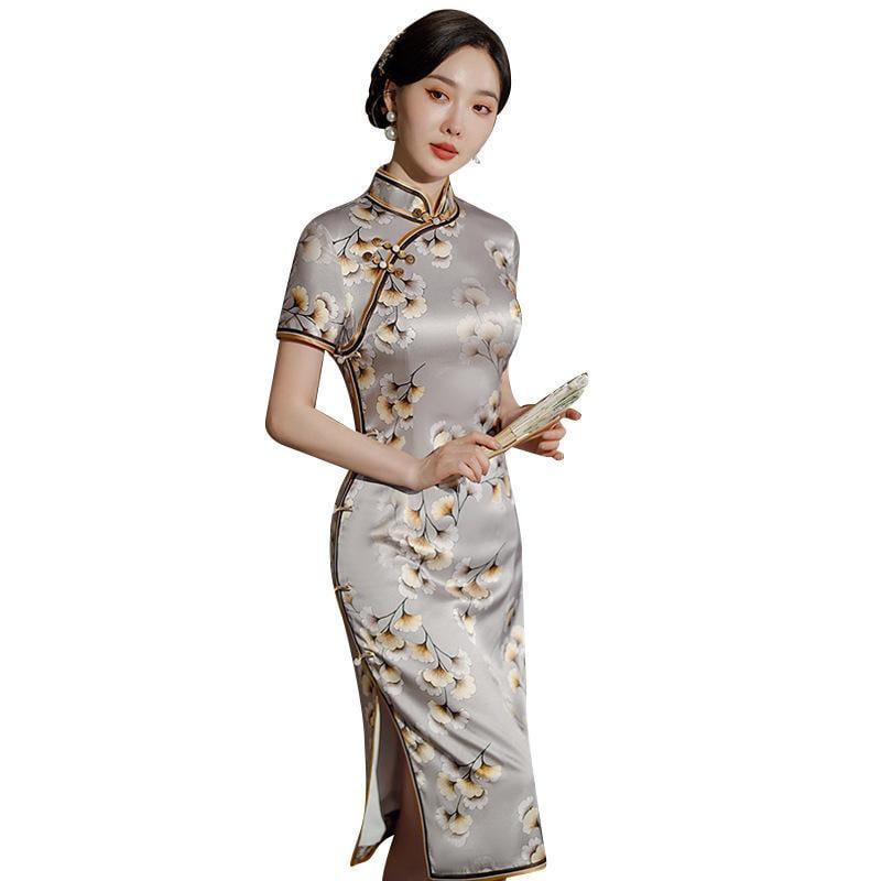 チャイナドレス レディース 春夏 シルク 絹 手作り おしゃれ 普段使い スリム ミディ丈 レトロ クラシック スタンドカラー 斜め襟 五分袖 伸縮性